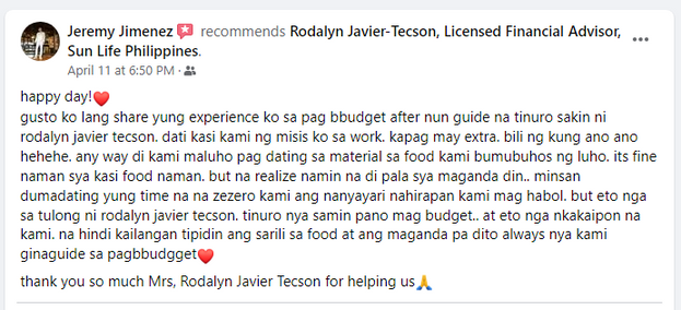 My driven goal is to educate our fellow Filipinos from my experiences, since at first I wasn't a believer. However, life put me and my family in a worse situation, and I realized that I must be the way for others to build their prevention and protection plans with financial goals.