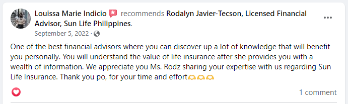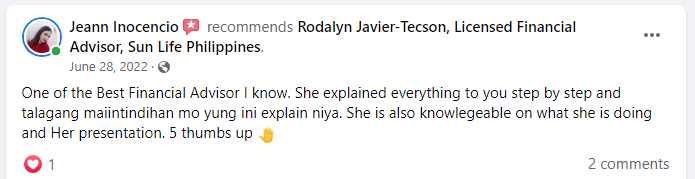 I'm so glad you found me! After I passed the examination and got my license from the Insurance Commission of the Philippines, I immediately dived in to know everything under the sun, studying and learning. I have gained a lot of knowledge on how to protect your money, your future, and your family.